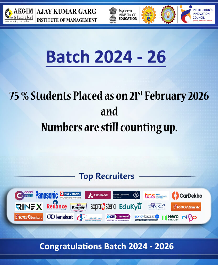 AKGIM Ghaziabad, in its continued journey towards holistic academic and professional excellence, has consistently been instrumental in facilitating meaningful and career-oriented placement opportunities for its students. Upholding this strong legacy, the Institute has commenced the final placement process for the Batch 2024–26, which is currently in progress and receiving encouraging responses from industry.